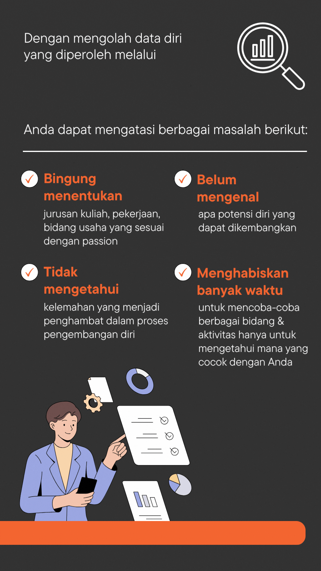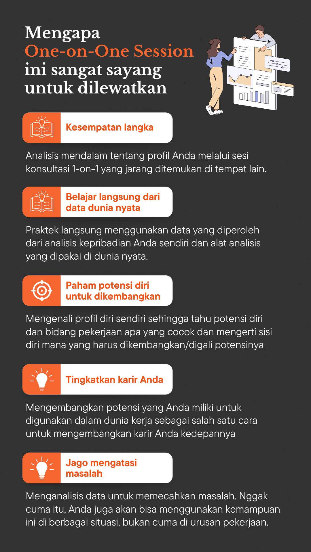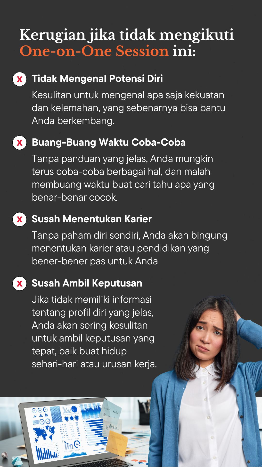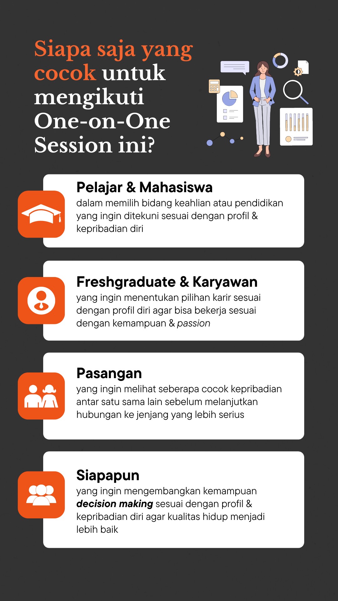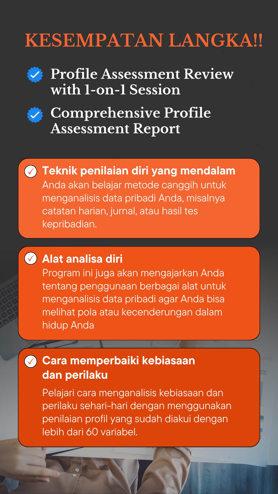 Pahami tentang diri sendiri melalu Profile Assesment with One-on-One Session untuk meningkatkan kualitas hidup Anda dalam menentukan pilihan hidup yang tepat.